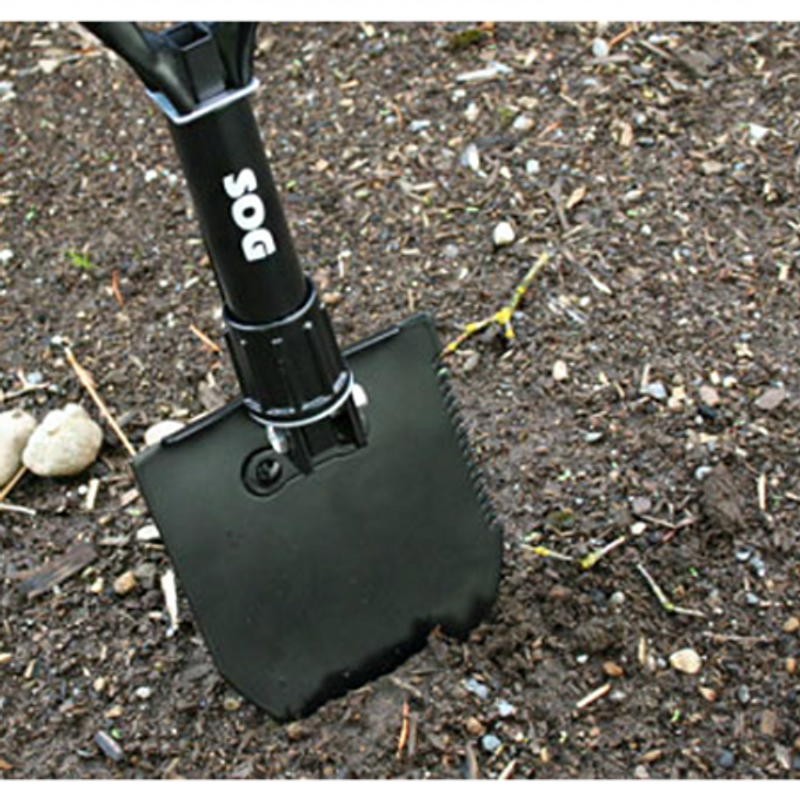 Entrenching Tool - Tempered high carbon steel construction with black powder coating. 18 1/4" overall when assembled. Folds down to 7 1/4". 6 1/2" shovel head. One side of shovel is serrated. 4 3/4" pick. Triangular handle. Black nylon belt sheath.